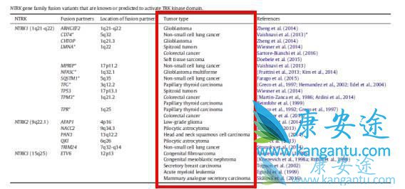 在体外模型中,具有抗TKRA活性的酪氨酸激酶抑制剂ARRY-470,Lestaurtinib(CEP-701)和Crizotinib可以使细胞周期停滞,抑制细胞增殖。在Vaishnavi的研究中,携带MPRIP-NTRK1的NSCLC患者接受了Crizotinib的治疗,该患者在接受治疗后肿瘤缩小,CA125下降,但在3个月后疾病进展。虽然目前还没有专门针对肺癌NTRK1融合基因阳性患者的临床试验,但TSR-011、PLX7486等具有TRK抑制剂作用的药物在NRTK重排的实体瘤中的临床试验已经开始。
