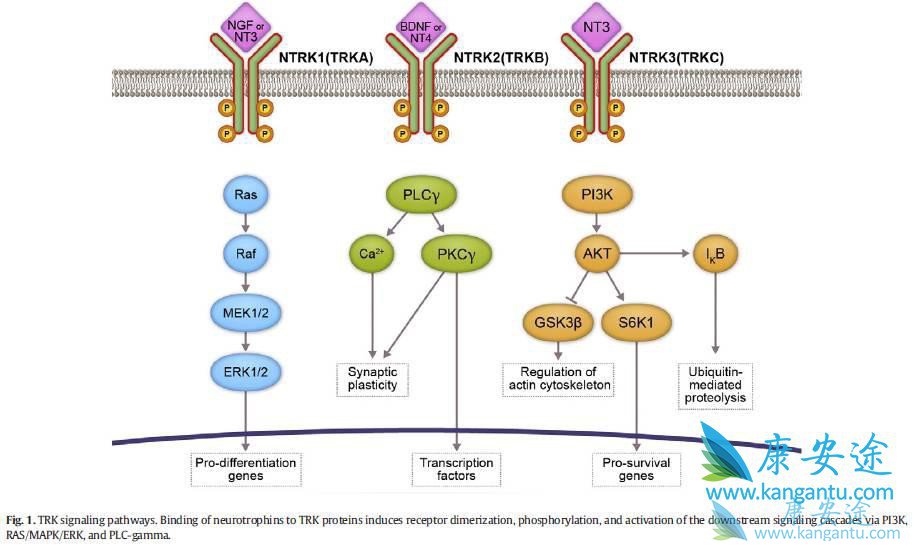 NTRK基因包含NTRK1、NTRK2和NTRK3,分别负责编码原肌凝蛋白受体激酶(TRK)家庭蛋白TRKA TRKB和TRKC的合成。神经营养因子与TRK蛋白质结合后可诱导受体二聚体化、磷酸化并激活下游PI3K、RAS / MAPK / ERK和PLC-γ的信号级联通路。TRK信号通路的改变,包括基因融合、蛋白过度表达或单核苷酸改变,已经被发现是许多肿瘤的致病原因,特别是NTRK基因的融合,是目前其中最明确的致癌原因。