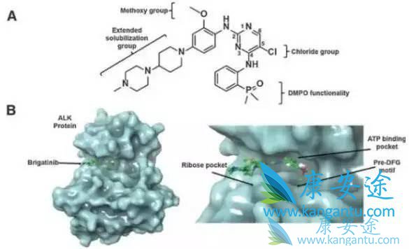 ▲Brigatinib 的分子结构与作用机理(图片来源:《Clinical Cancer Research》)