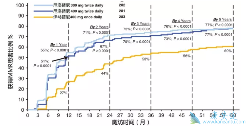 ENESTnd 研究纳入 846 名初治 CML 成人患者,按 Sokal 风险指数以 1:1:1 的随机分为 3 组,尼洛替尼 300 mg 1 天 2 次,尼洛替尼 400 mg 1 天 2 次及伊马替尼 400 mg 1 天 1 次。观察终点包括 MMR、分子遗传学有效率 4 (MR4,BCR-ABLIS ⩽ 0.01%)及 4.5 (MR4.5,BCR-ABLIS ⩽ 0.0032%)、进展至加速期或急变期(AP/BC)。通过至少 5 年的随访,在尼洛替尼 300 mg组、400 mg组、伊马替尼组,分别有 77.0%、77.2%、60.4% 的患者获得 MMR(图1),有 65.6%、63.0%、41.7% 的患者获得 MR4,以及分别有 53.5%、52.3%、31.4% 的患者获得 MR4.5。共有 3 名患者疾病进展为 AP/BC,包括尼洛替尼 300 mg组 1 名,伊马替尼组 2 名,均发生在随访的第 4 至第 5 年间。